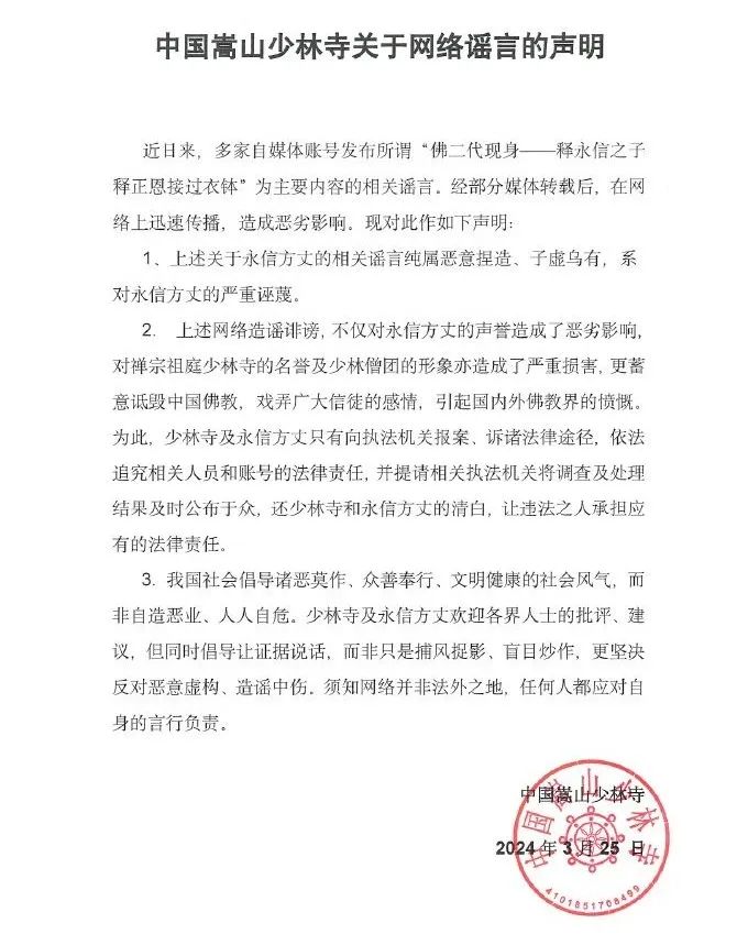 3月26日,中国嵩山少林寺发布关于网络谣言的声明: