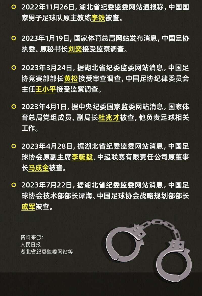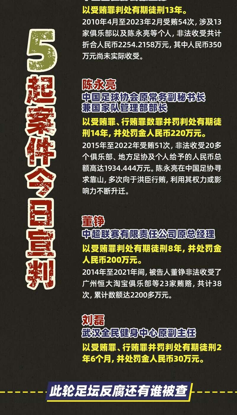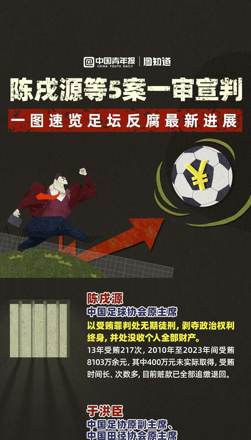 3月26日上午,5起足球领域腐败案件在湖北黄石等地法院一审宣判。其中,中国足协原主席陈戌源以受贿罪判处无期徒刑。案件结果如何?还有哪些人被查?一图速览最新进展。