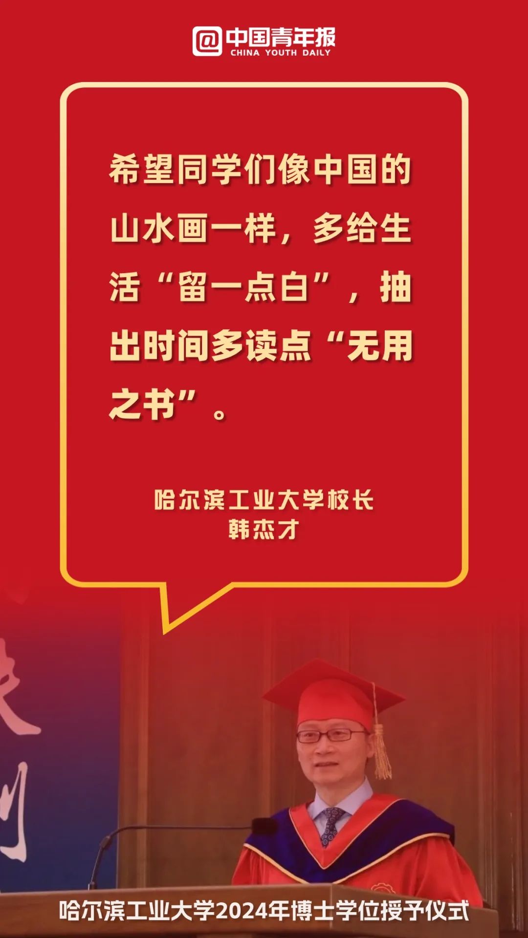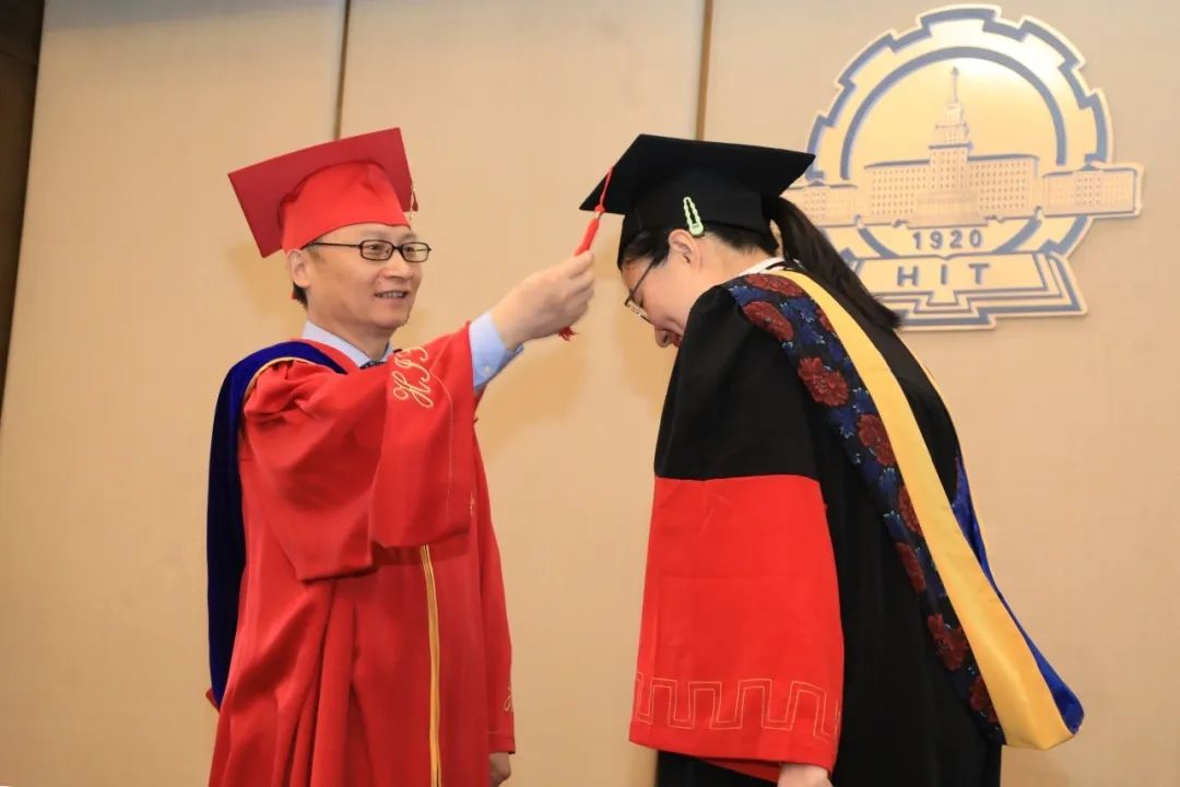 哈工大校长韩杰才逐一为毕业生援正流苏,寄语即将踏上新征程的学子: