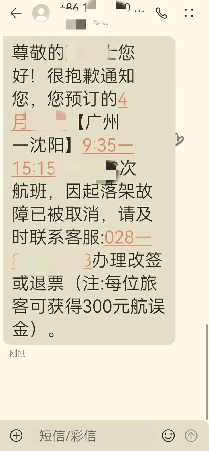 陶女士计划和家人去沈阳旅行,便提前预订了从广州飞往沈阳的航班,但就在出发的那天凌晨,陶女士突然收到了一条短信:“尊敬的XX您好!很抱歉通知您,您预订的4月X日【广州—沈阳】9:35—15:15XXX次航班,因起落架故障已被取消。请及时联系客服:XXXX办理改签或退票(注:每位旅客可获得300元航误金)。”