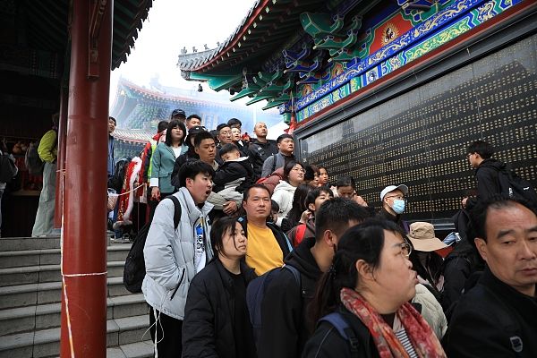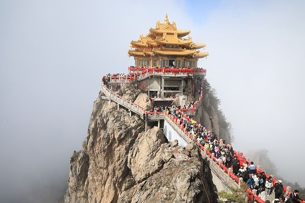 2024年4月4日,河南省洛阳市栾川县境内的老君山风景区浓雾笼罩,当阳光偶尔呈现,金顶和群山在浓雾中若隐若现,美如仙境。当日,河南洛阳老君山景区游客爆棚,景区实施了限流管控。