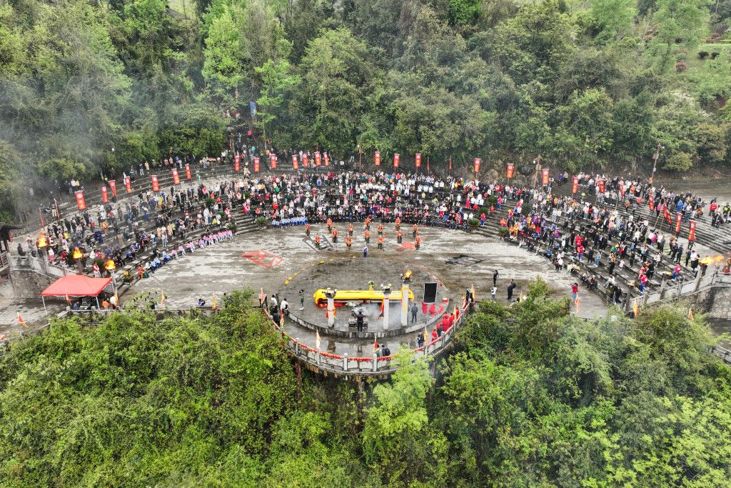 2024年4月5日,第十六届仡佬族祭天朝祖祭祀大典在贵州遵义务川仡佬族苗族自治县九天母石景区举行。仡佬族祭天朝祖祭祀大典现场。(无人机照片) 中新社记者 瞿宏伦 摄