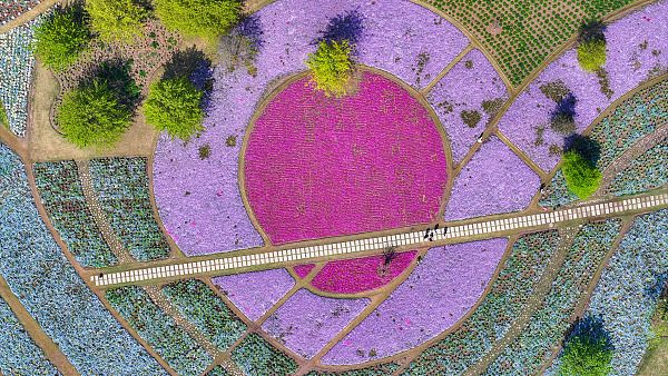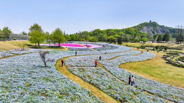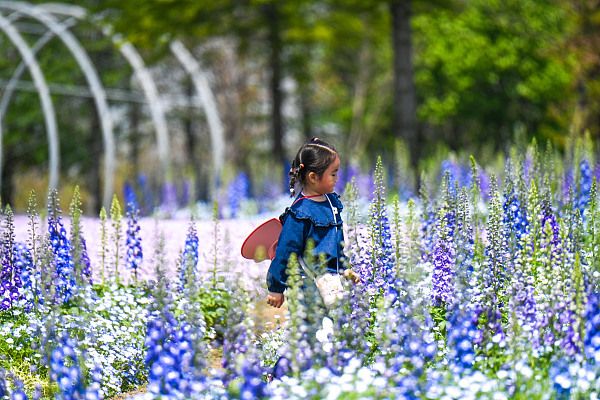 2024年4月9日,游客在上海松江区辰山植物园赏花。进入四月,在上海辰山植物园3500平米喜林草花海, 60000株开蓝色花的喜林草,12000株红、黄、橙、白色的冰岛虞美人和5000株亮黄色的花菱草混种,构成了壮观的花海大地,吸引不少游客前来游玩赏花。