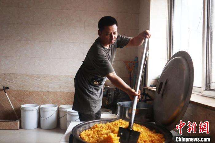 刘秀富正在搅拌原料。 苍雁 摄