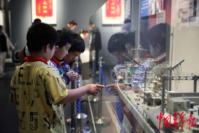 4月19日,山东青岛,中国人民解放军海军博物馆,几名小朋友在一艘补给舰模型前参观。中青报·中青网记者 孔斯琪/摄
