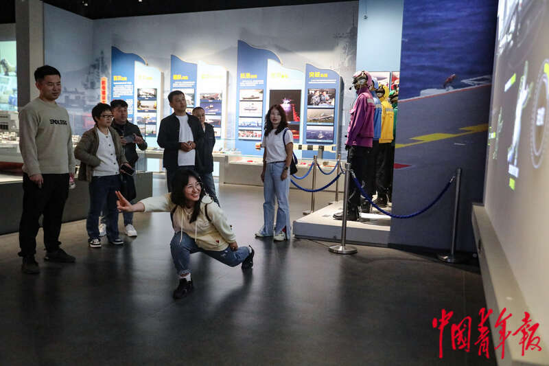 4月19日,山东青岛,中国人民解放军海军博物馆,一名参观者在“航母style”互动体验区摆姿势,指挥屏幕里航母甲板上的虚拟战斗机“起飞”。 中青报·中青网记者 孔斯琪/摄