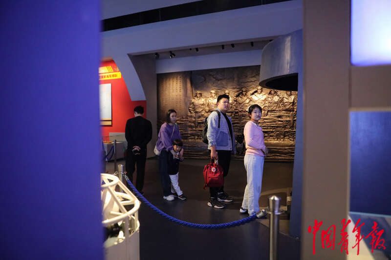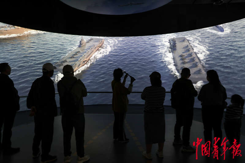 4月19日,山东青岛,中国人民解放军海军博物馆,参观者们在一处沉浸式展览空间中观看短片。中青报·中青网记者 孔斯琪/摄