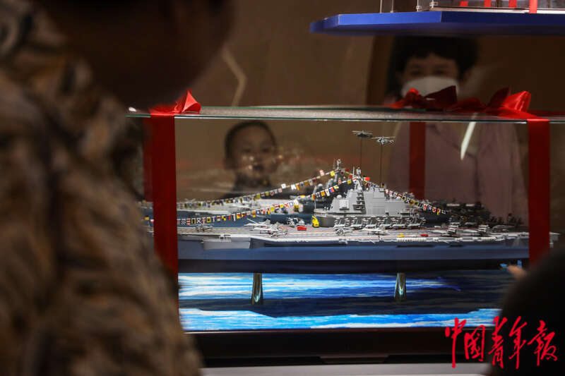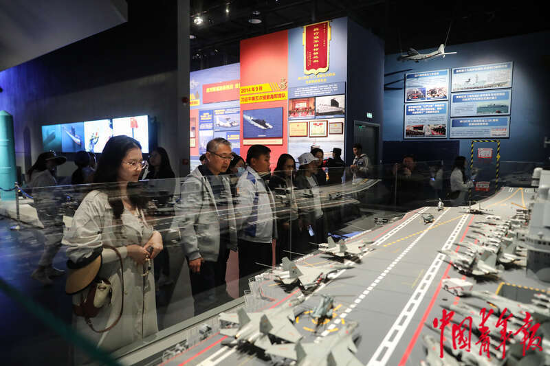 4月19日,山东青岛,中国人民解放军海军博物馆,参观者在中国第一艘航母——16舰的模型前驻足。人民海军成立75周年之际,不少市民游客来到海军博物馆了解中国海军的发展历程、英勇事迹和伟大成就。海军博物馆主展馆设有人民海军历史基本陈列4个展厅,分为社会主义革命和建设时期、改革开放和社会主义现代化建设新时期、中国特色社会主义新时代三个前后衔接的篇章,系统展现在党的领导下人民海军取得的历史性成就、发生的历史性变革。中青报·中青网记者 孔斯琪/摄