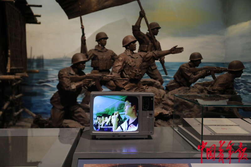 4月19日,山东青岛,中国人民解放军海军博物馆,一处展区的电视里播放着南沙海战的相关录像。中青报·中青网记者 孔斯琪/摄