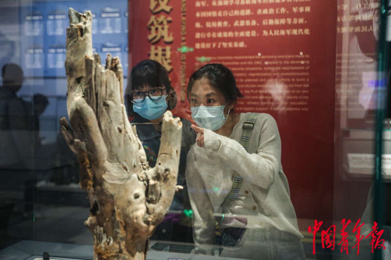 4月19日,山东青岛,中国人民解放军海军博物馆,两名参观者在观看来自上甘岭战场的枯枝。这是朝鲜人民军代表团赠送给东海舰队的礼物。此枯枝的长度仅85厘米,竟嵌入35枚炮弹弹片,真实反映了1952年10月上甘岭战役的惨烈。中青报·中青网记者 孔斯琪/摄