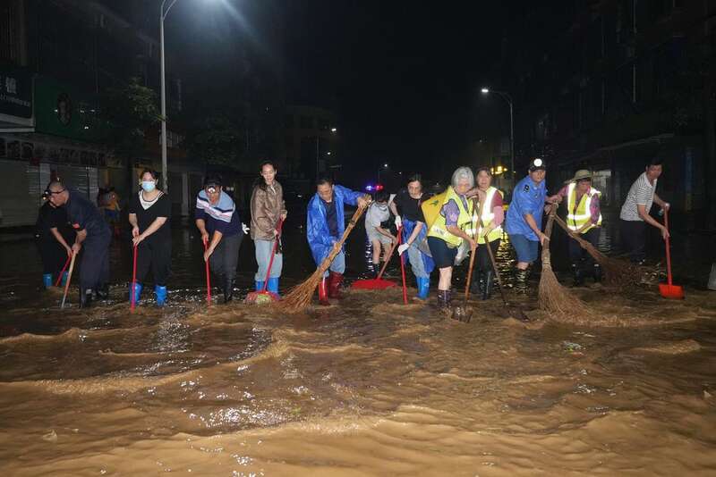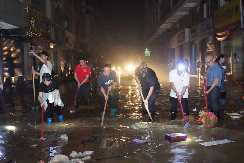 在浛洸大道,路面上仍有少量积水,镇政府工作人员、环卫工人及附近商铺的老板正在清扫路面。李华打着手电,朝前路水深处张望,“我的档口在那里,就等水退了去打扫。”