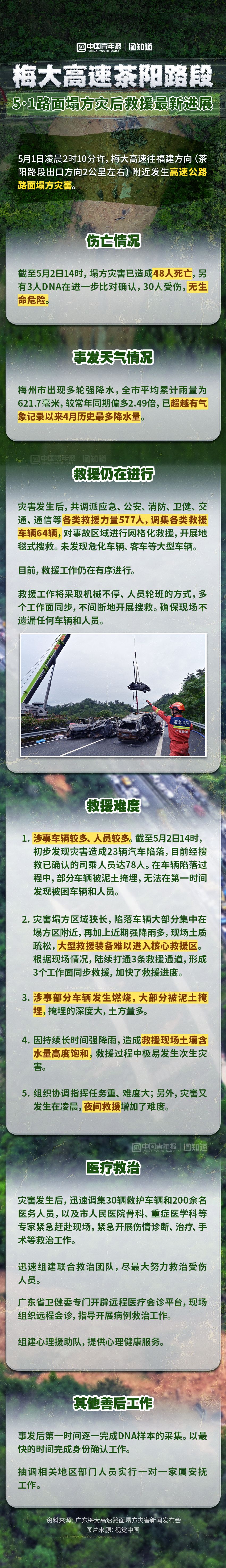 5月2日下午举行的广东梅大高速路面塌方灾害新闻发布会公布了救援最新进展。5月1日凌晨2时10分许,梅大高速往福建方向(茶阳路段出口方向2公里左右)附近发生高速公路路面塌方灾害。截至5月2日14时,塌方灾害已造成48人死亡,另有3人DNA在进一步比对确认,30人受伤,无生命危险。现场救援、救治进展如何,救援面临什么样的难度,善后工作如何推进?一图速览↓↓↓