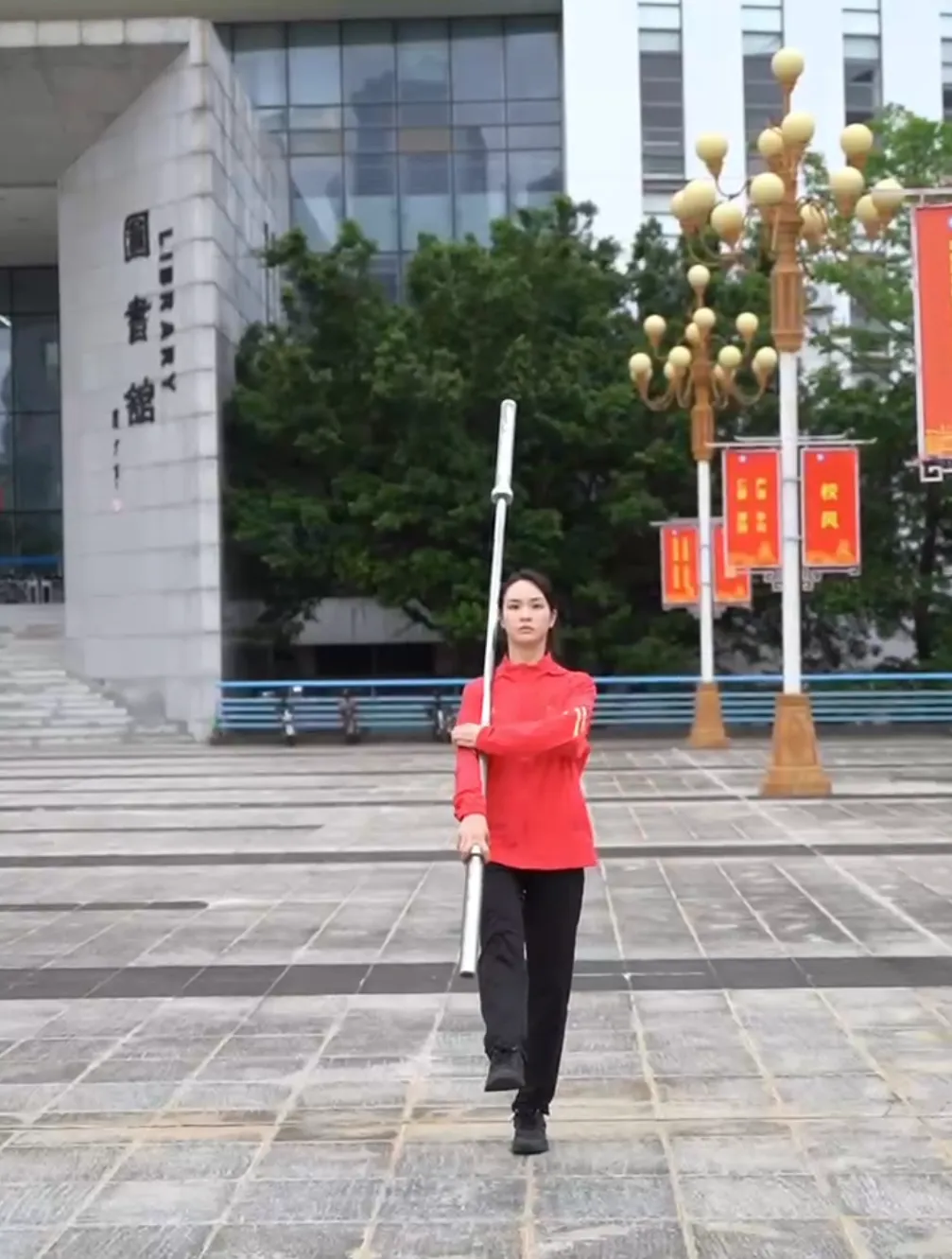 “我们的训练要求比较高。”国旗护卫队队长谭小晖老师说,学校升国旗仪式上旗手使用的旗杆是6斤左右,但是训练时学生用的训练杆重32斤,用重杆练习,主要是为了能够练出压杆和扣杆的稳定性,防止行进的过程上下跳杆和左右摆杆,同时防止风大的时候会不稳。训练中,我们还会采用拉绳定位的方式,并使用沙袋和哑铃等辅助训练器材,以提高训练的效果。