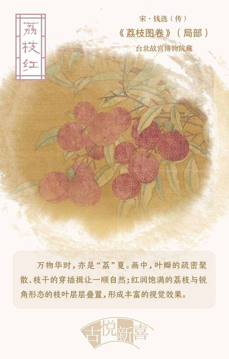 万物华时,亦是“荔”夏。五月,早熟的荔枝已经上市,宋末元初画家钱选(传)《荔枝图卷》便展现了此时累累荔枝成熟可人的景象。画中,叶瓣的疏密聚散、枝干的穿插揖让一顺自然;红润饱满的荔枝与锐角形态的枝叶层层叠置,形成丰富的视觉效果;5只小鸟分栖于密林间,或相呼相望,或隐身叶后,或回首观蝶,或独自鸣唱,整幅画卷恰如一首轻快的协奏曲,让鸟语果香环绕观者周围,展现了画家平淡天真的审美趣味。