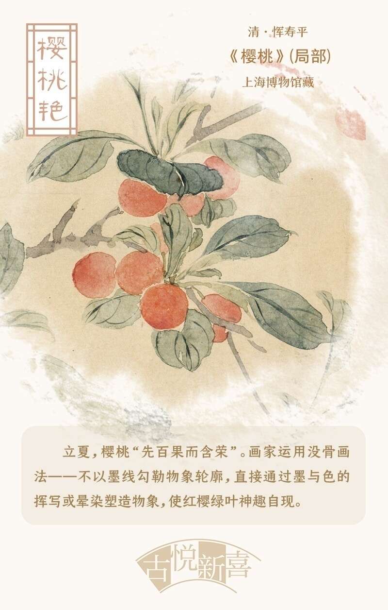 以画为媒,品味立夏之美,不仅在于欣赏节气胜景,更在乎于精微刻画中探求中华美学的传承演变,启发创新灵感。譬如,前述宋代画作多以淡墨双钩填色,或彩或墨,层层渲染,逐渐将墨线融于彩墨叠加之中。这种介于重彩院体画与文人水墨画之间的风格,实际上潜隐着后世写意水墨花鸟画勃兴的趋势,当代美术工作者可从中体悟表现技法及精神旨趣的深刻转变。