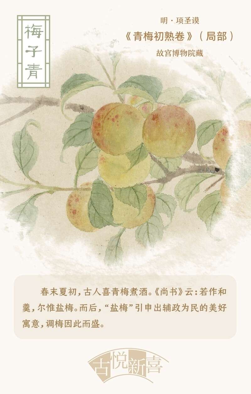 在我国部分地区,立夏之日品尝时鲜是一种传统习俗。所谓“时鲜”具体指哪些食物,各地有不同说法,但都体现了“应季而食”的生活智慧,反映了中国人尊重自然、顺应自然、天人合一的哲学理念。春末夏初之时,古人喜青梅煮酒,以其新酸益于脾胃。《本草纲目》中说“梅者媒也,媒合众味”,宜甜宜咸的青梅适配各种味道。《尚书》更有“若作和羹,尔惟盐梅”之句。梅酸盐咸能大大改善食物的口味,“盐梅”由此引申出辅政为民的美好寓意,调梅也因此而盛。明末清初画家陈洪绶的《调梅图》即以此为题成清雅婉约之作。画作笔墨从容舒缓,画中人物神情温婉柔和。妇人端坐于石凳之上,两位侍女在火炉旁调制梅子。太湖石、花觚、矮榻造型典雅,花枝设色清丽,协以调梅雅事,意境深远,于朴素淡然中传递出高古气息。