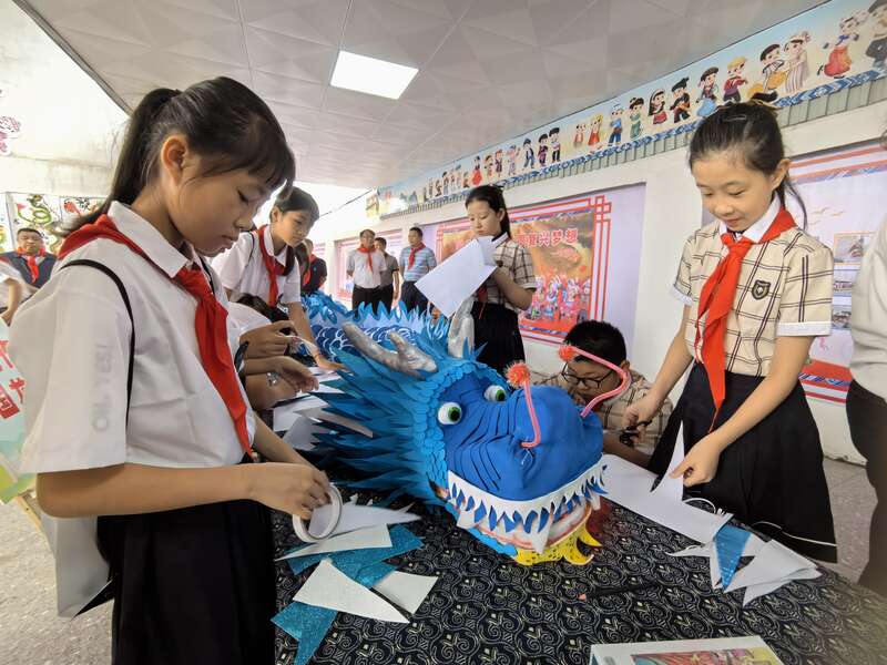 5月7日,在南宁市宾阳县宾州镇恭村完小,少先队员学习非遗炮龙扎制。江畅/摄