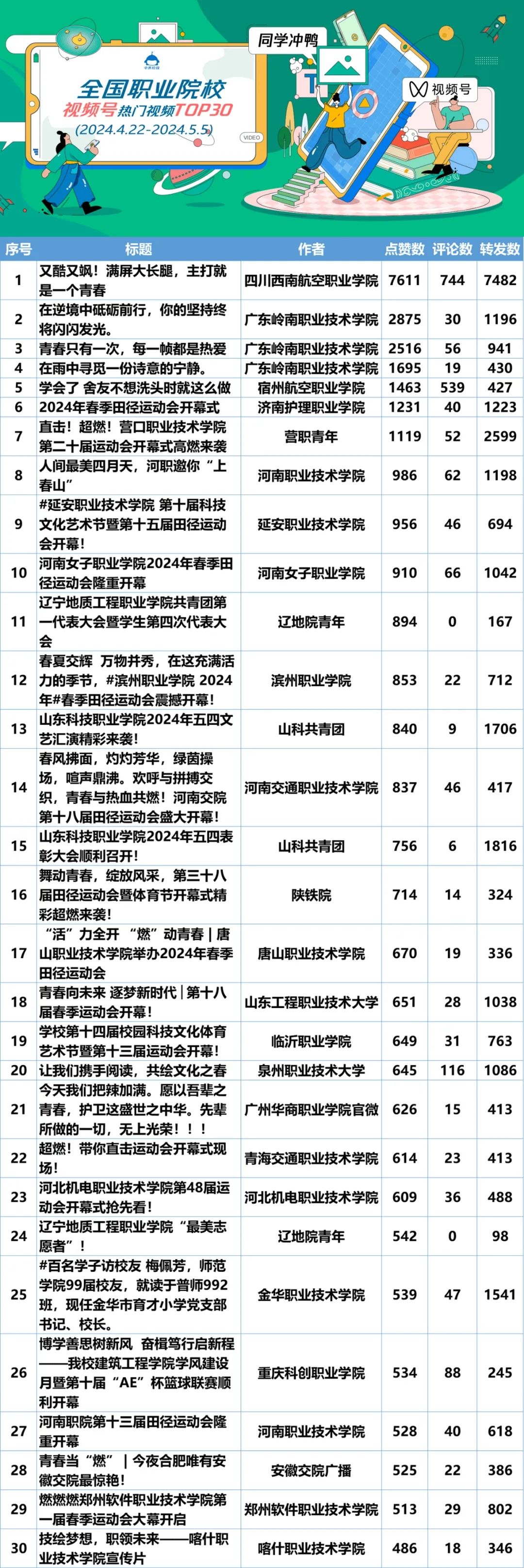 以上为本期职业院校热度TOP30的视频,其中有7条视频点赞量超过1000,点赞量最高的为《又酷又飒!满屏大长腿,主打就是一个青春》(四川西南航空职业学院),获得了7611点赞。
