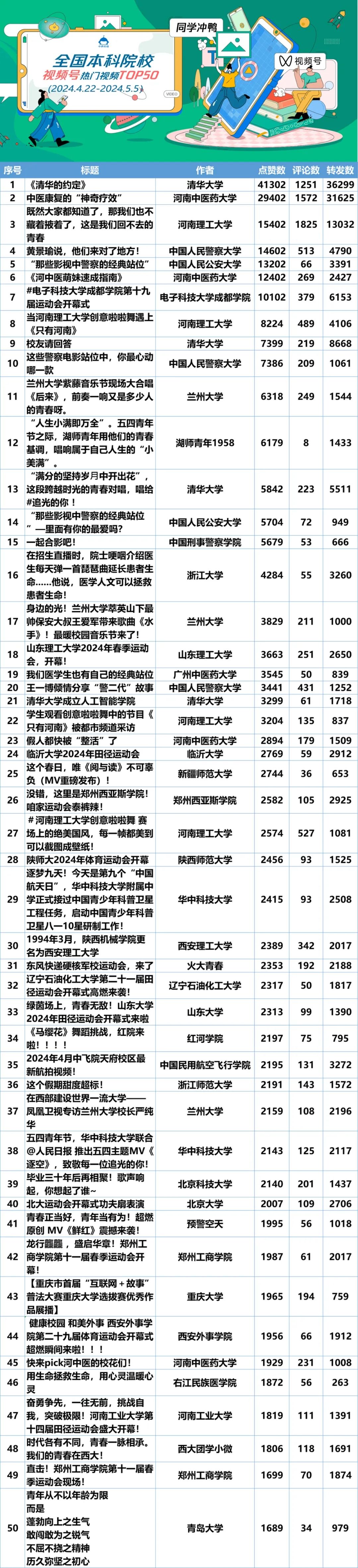 以上为本期本科院校热度TOP50的视频,其中有15条视频点赞量突破5000。其中点赞量最高的为《清华的约定》(清华大学),获得了41302点赞。