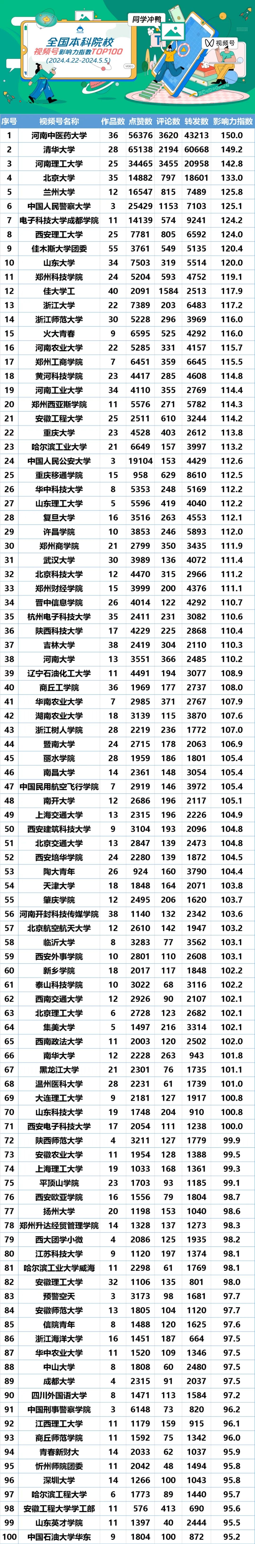 根据统计,河南中医药大学(150.0)、清华大学(149.2)、河南理工大学(142.8)位居全国本科院校视频号影响力指数前三甲;北京大学(133.0)、兰州大学(125.8)、中国人民警察大学(125.1)、电子科技大学成都学院(124.2)、西安理工大学(124.0)、佳木斯大学团委(120.4)、山东大学(120.0)进入前十名。