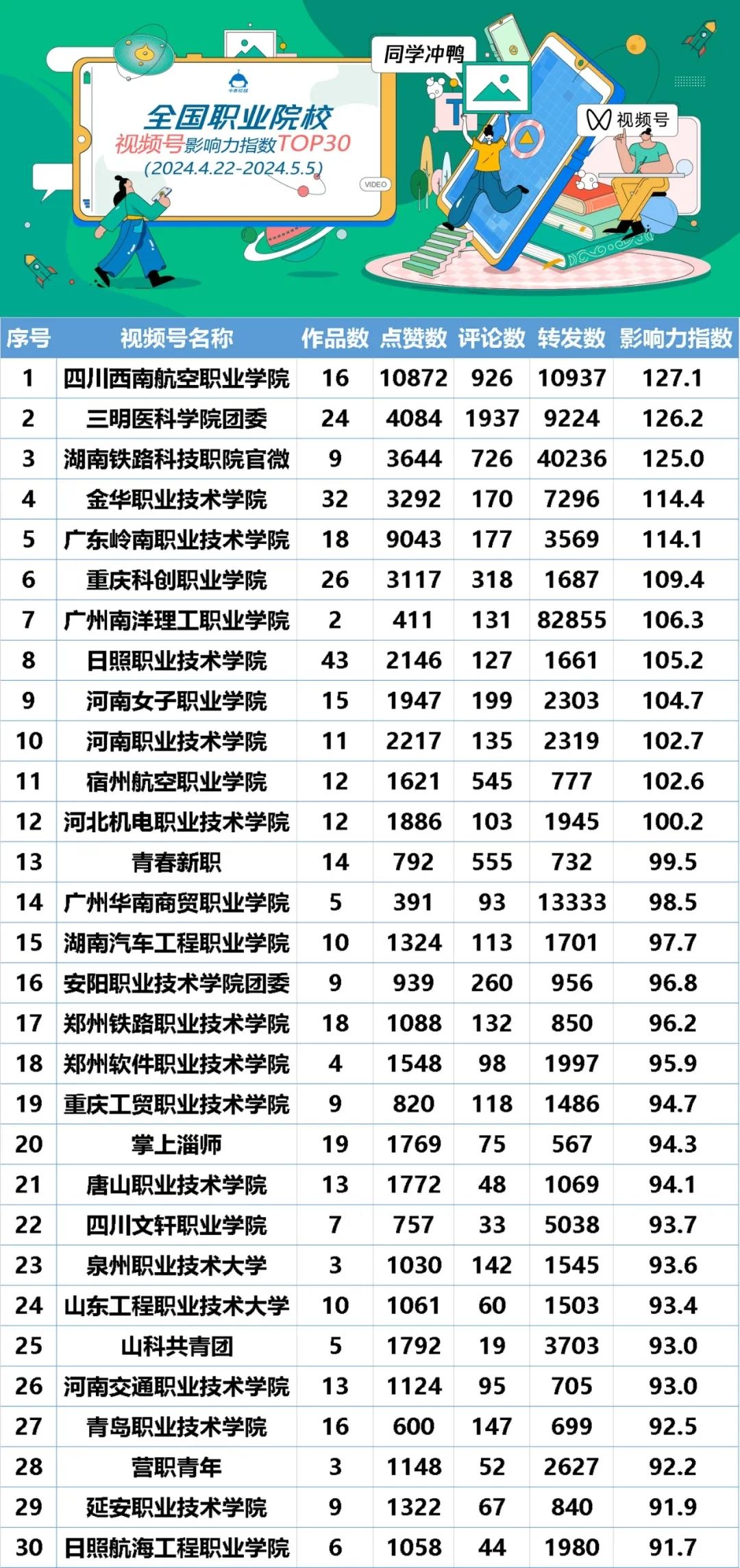 根据统计,西安航空职业技术学院(127.1)、三明医科学院团委(126.2)、湖南铁路科技职院官微(125.0)位居全国职业院校视频号影响力指数前三甲;金华职业技术学院(114.4)、广东岭南职业技术学院(114.1)位列前五名。
