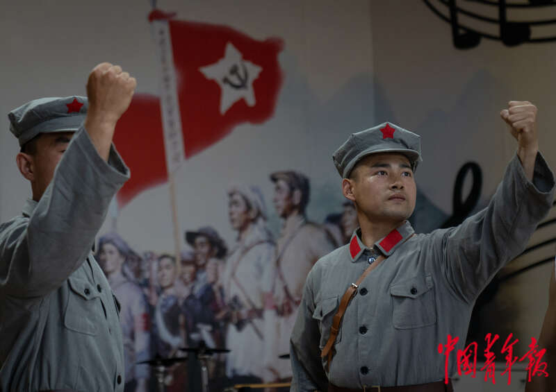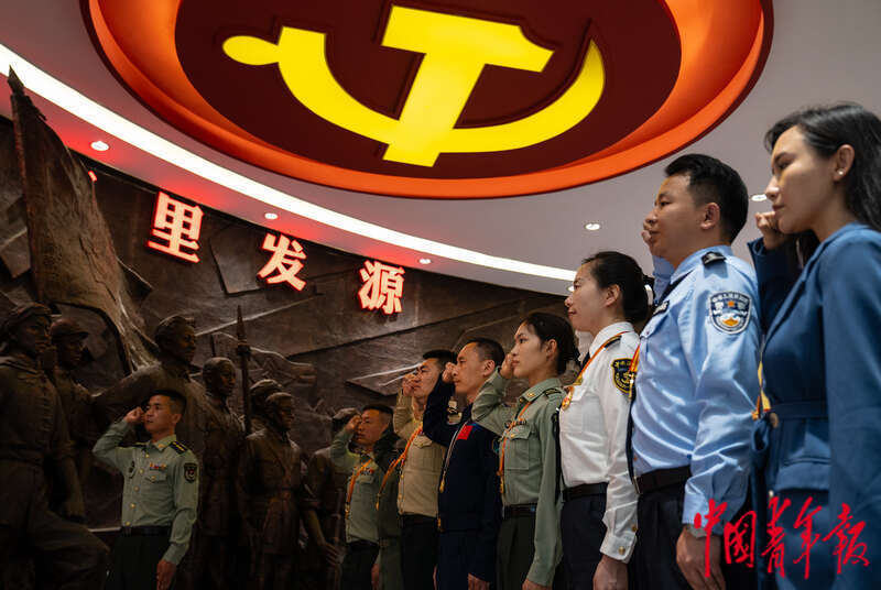 5月9日,陆军某部“红一连”连史馆展厅, 参观结束后,8名军地青年典型站在“军魂从这里发源”雕塑前,整齐列队、高举右拳,重温入党誓词,回顾入党初心。青年典型、陆军某部连长陈晶深有感触地说:“在这里,我感受到了红军部队的红色血脉和光荣传统。我也要带领连队像‘红一连’那样听党话、跟党走,坚守初心本色,担当强军重任。”中青报·中青网记者 李峥苨/摄