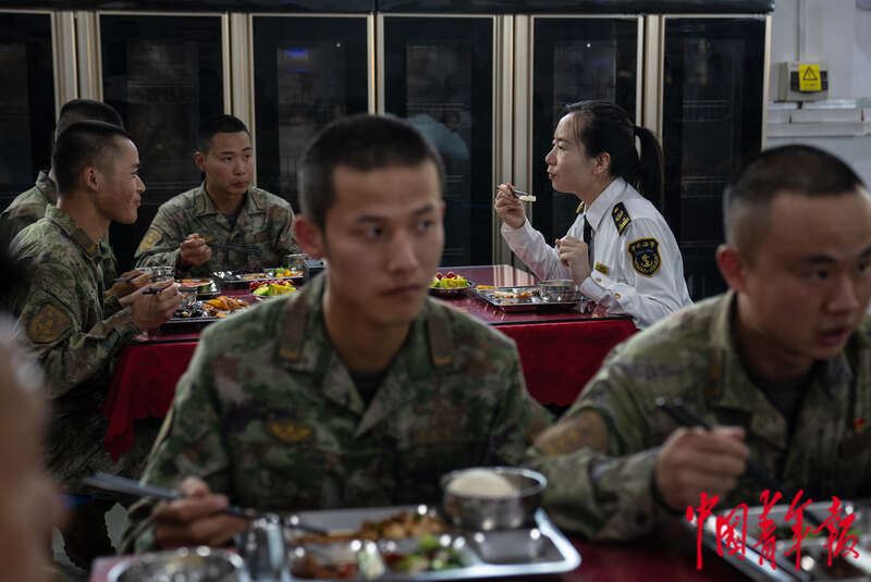 5月9日,陆军某部“红一连”,青年典型、上海海事局东海海巡执法总队“90”后船长詹春珮与官兵边用餐边交流。学习了青年典型的事迹,“红一连”官兵纷纷表示:“作为红军部队的传人,我们要以他们为榜样,传承红色基因不变色,用铁的信仰坚定追随,练强过硬本领,为实现建军一百年奋斗目标不懈奋斗。”中青报·中青网记者 李峥苨/摄