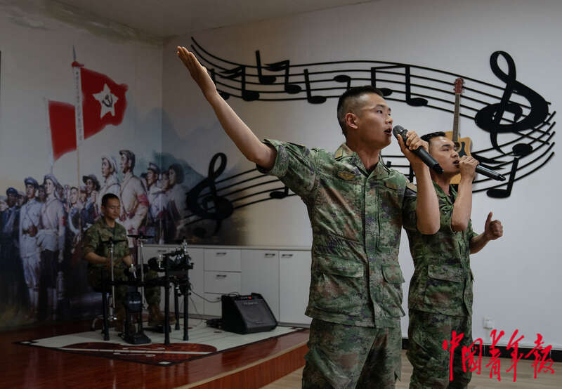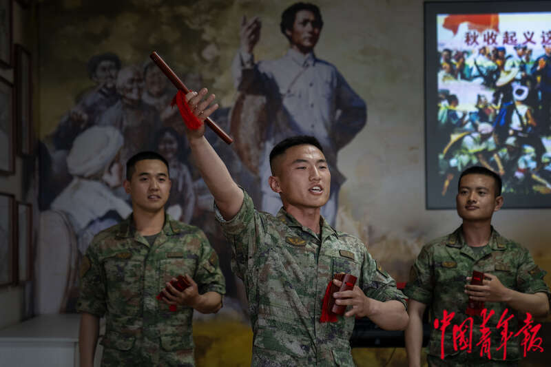 5月9日,陆军某部“红一连”“两个基层群众组织”工作室,连队官兵为8名军地青年典型表演自创的“支部建在连上”情景剧、“红色传统”快板等文艺节目。中青报·中青网记者 李峥苨/摄
