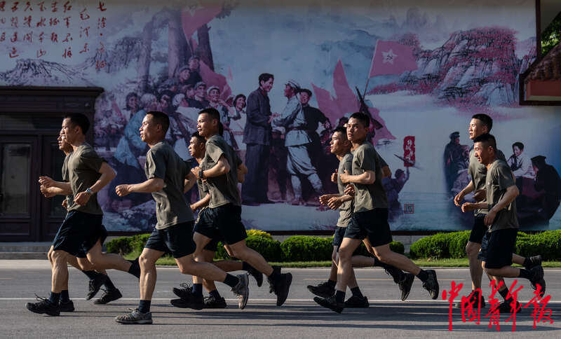 5月9日,陆军某部“红一连”,官兵们在营区内训练,他们跑步经过的营房外墙上,绘画着秋收起义等历史场景的壁画。中青报·中青网记者 李峥苨/摄