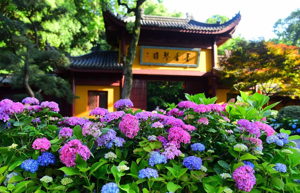 2024年5月14日,杭州,飞来峰景区的永福寺,各色绣球花渐次绽放,沿着开满绣球花的小道拾级而上,有着千年的历史的黄墙古寺,禅意十足。