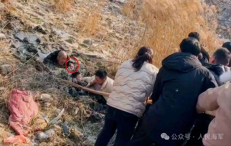 △ 村民用手机拍摄的救援现场画面,红圈内为正在托举小孩的刘少凤。
