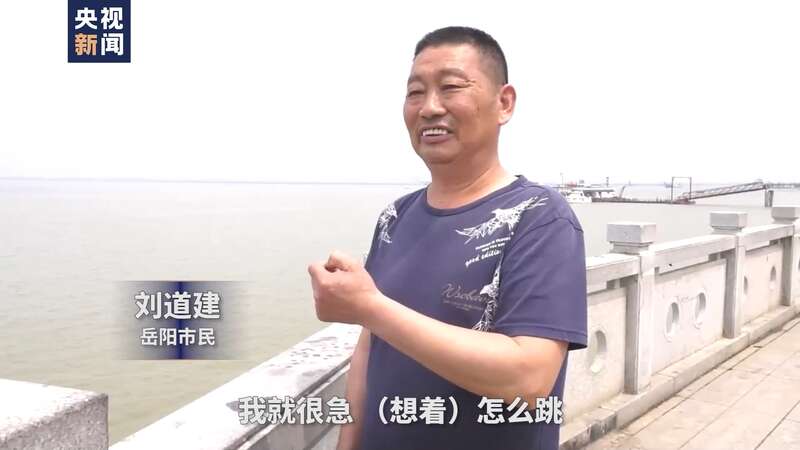 5月21日下午,在湖南岳阳洞庭湖街河口区域,一名男子不慎落水。关键时刻,正在岸边休息的65岁岳阳市民刘道建,直接从约6米高的湖堤跃入水中展开救援。