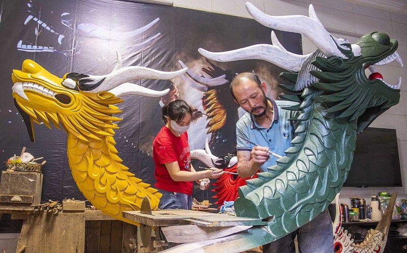 2024年5月28日,在湖南省永州市道县濂溪街道东阳社区,省级非遗传承人陈兵寿在给龙船的“龙头”裱漆。