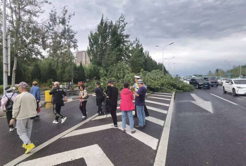 16时许,二环主路广渠门桥北向南方向,路树倒伏挡住最外侧车道,车辆通行受阻,后方车辆逐渐开始排队。东城交通支队前门大队民警到达现场后,开启警灯,码放锥桶封闭部分车道,引导车辆远离树枝,配合作业人员及时清理,并根据清理进度逐步缩小封闭车道,增加车辆通行空间。