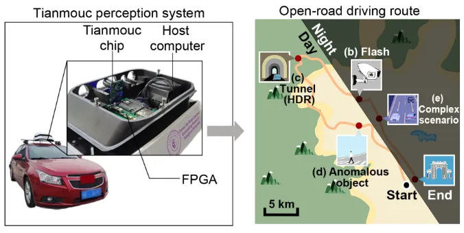 基于“天眸芯”,团队还自主研发了高性能软件和算法,并在开放环境车载平台上进行了性能验证。在多种极端场景下,该系统实现了低延迟、高性能的实时感知推理,展现了其在智能无人系统领域的巨大应用潜力。