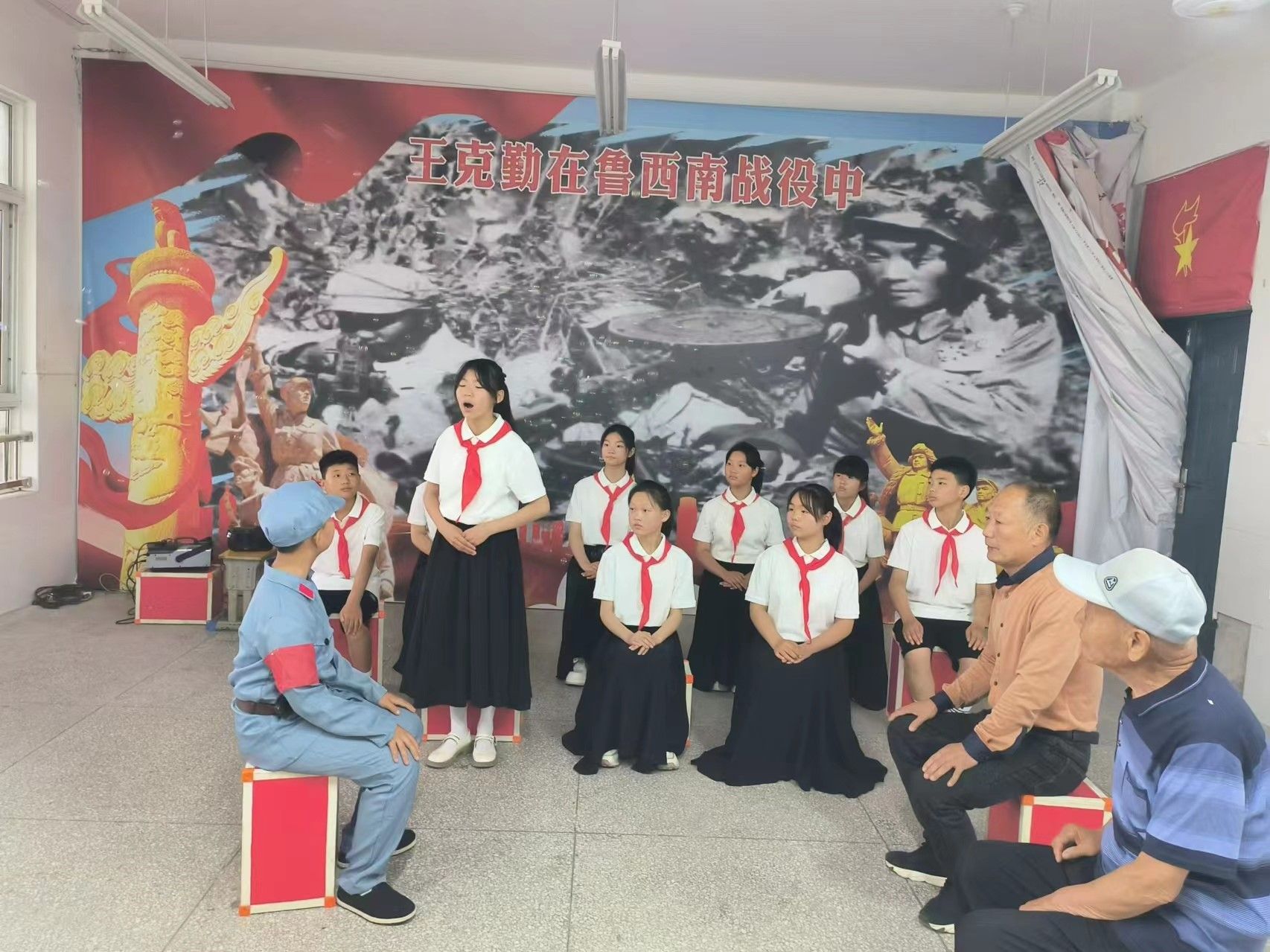 演出活动现场,随着背景乐曲响起,由青年学生王子宸扮演的“王克勤”神色肃穆步入舞台中央,与在场少先队员们及关工五老人员(老干部,老教师,老战士,老专家,老模范)互动交流,询问大家现在的生活状况。少先队员们纷纷起立,向英雄分享家乡的变化和新中国建设的伟大成就。