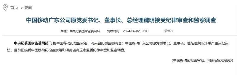 中央纪委国家监委网站6月2日公布的信息显示,据中国移动纪检监察组、河南省纪委监委消息:中国移动广东公司原党委书记、董事长、总经理魏明涉嫌严重违纪违法,目前正接受中国移动纪检监察组和河南省商丘市监委纪律审查和监察调查。