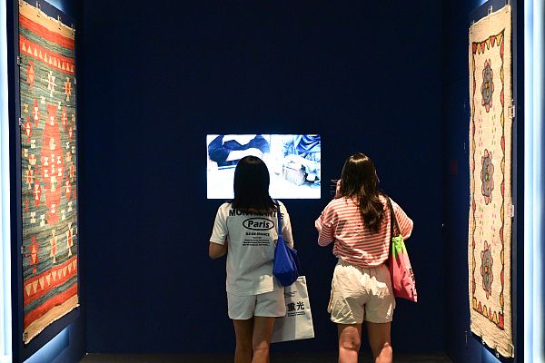 2024年6月6日,由中国国家博物馆与“冲突地区遗产保护国际联盟”共同主办的“守护与重光”展览在位于北京的中国国家博物馆开幕。此次展览从该联盟在35个国家支持的450个项目中遴选重点项目,以“遗产之殇”“联盟的诞生和使命”“遗产守护”“遗产与人”“遗产之美”五个部分,首次全景呈现世界濒危文化遗产现状和保护成果,彰显文化遗产保护工作者携手捍卫人类共有精神家园的坚定信念,表达重建和平的美好愿景。图为参观者通过视频了解阿富汗苏尔赫达尔传统纺织工艺。 中新社记者 田雨昊 摄