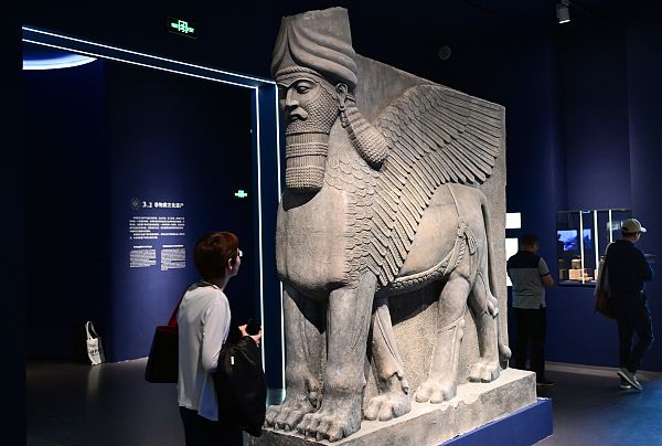 2024年6月6日,由中国国家博物馆与“冲突地区遗产保护国际联盟”共同主办的“守护与重光”展览在位于北京的中国国家博物馆开幕。此次展览从该联盟在35个国家支持的450个项目中遴选重点项目,以“遗产之殇”“联盟的诞生和使命”“遗产守护”“遗产与人”“遗产之美”五个部分,首次全景呈现世界濒危文化遗产现状和保护成果,彰显文化遗产保护工作者携手捍卫人类共有精神家园的坚定信念,表达重建和平的美好愿景。图为参观者观看拉玛苏雕塑仿制缩小件,收藏于伊拉克摩苏尔博物馆中的拉玛苏雕塑遭到破坏后碎裂为数百块残片。 中新社记者 田雨昊 摄