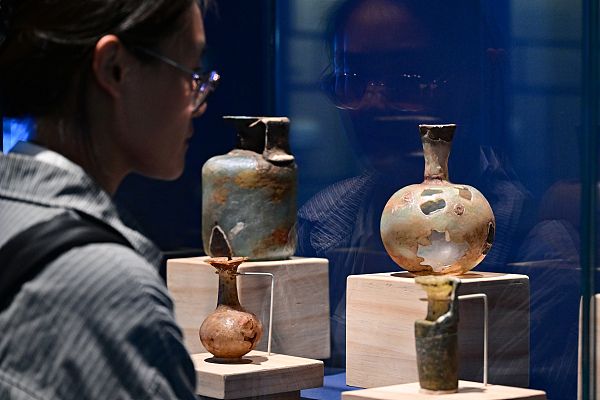 2024年6月6日,由中国国家博物馆与“冲突地区遗产保护国际联盟”共同主办的“守护与重光”展览在位于北京的中国国家博物馆开幕。此次展览从该联盟在35个国家支持的450个项目中遴选重点项目,以“遗产之殇”“联盟的诞生和使命”“遗产守护”“遗产与人”“遗产之美”五个部分,首次全景呈现世界濒危文化遗产现状和保护成果,彰显文化遗产保护工作者携手捍卫人类共有精神家园的坚定信念,表达重建和平的美好愿景。图为参观者观看修复后的玻璃器复制件(黎巴嫩)。 中新社记者 田雨昊 摄