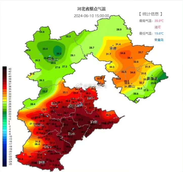 河北省气象台6月10日通报称,预计明天白天,保定、廊坊及以南地区最高气温可达37~39℃,其中保定南部、廊坊南部、石家庄、沧州西部、衡水、邢台、邯郸的部分地区可达40℃以上。河北省气象台6月10日17时继续发布高温红色预警信号,请注意防范。