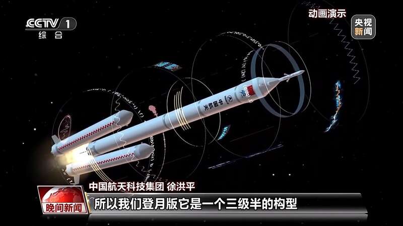 中国航天科技集团 徐洪平:发射奔月轨道,它需要的运载能力可能是更大,所以我们登月版它是一个三级半的构型,所谓三级半就是一子级、二子级和三级,那么再加两个助推。在近地版研制的时候,实际上我们就把一子级作为一个它通用模块,二子级也做一个适应性的改制,那么这样一来,近地版就是一个二级的近地轨道运载能力的火箭。