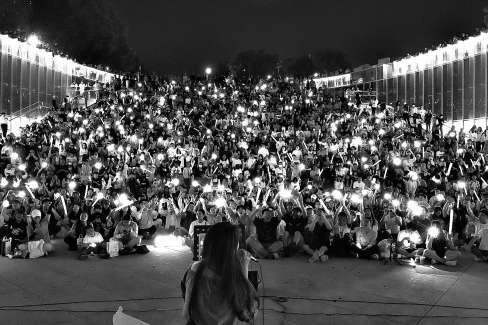 观众纷纷举起手机,打开手电功能,亮光映照在玻璃幕墙上,犹如繁星点点。唱至热烈处,歌迷们与歌手一起合唱,场面宛如明星演唱会的现场。