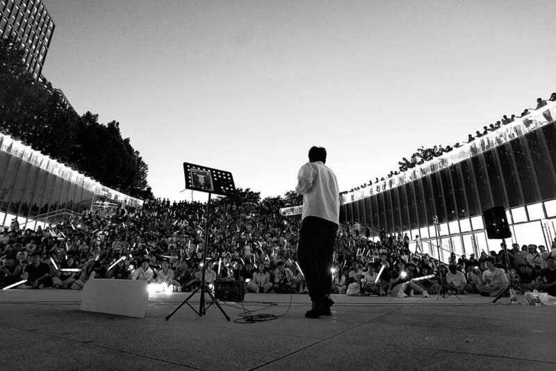 演出开始,下沉广场的台阶上,几百名观众坐得满满当当。没有占到座位的,有的站在围栏后观看,有的索性坐在广场空地上,在歌手前面围成一圈。