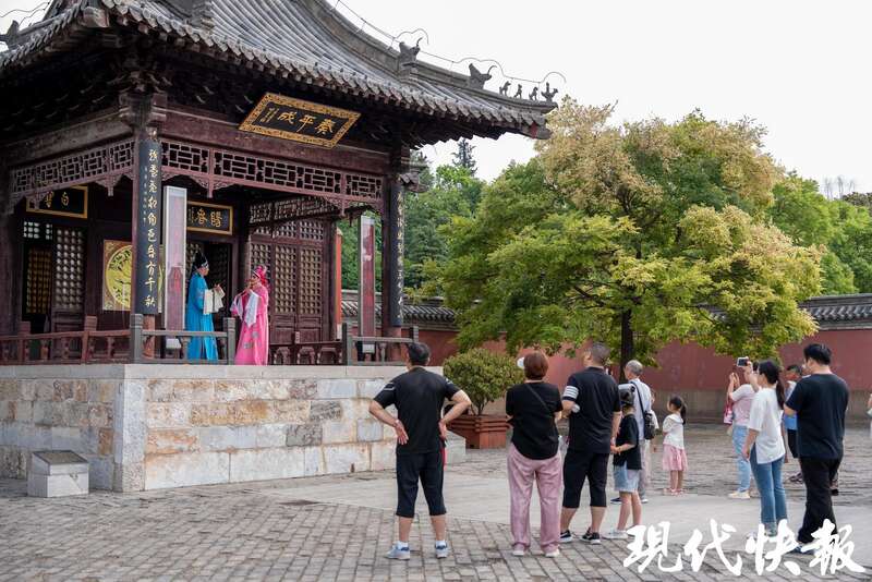 “青青荷叶清水塘,鸳鸯成对又成双……”在龙王庙行宫的古戏台上,柳琴戏《梁山伯与祝英台》正在上演。宿迁有句俗话“三天不听拉魂腔,吃饭睡觉都不香”,说的就是非遗柳琴戏。相传,清代康熙、乾隆皇帝就在这里观看柳琴戏。