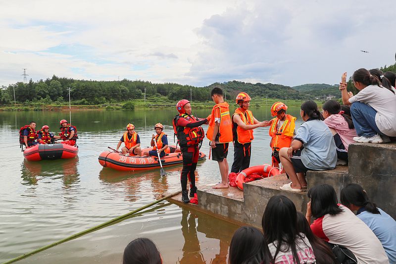 6月24日,湖南省永州市新田县枧头镇白茫井水库,救援人员在对学生进行抗洪防汛防溺水救援演练。