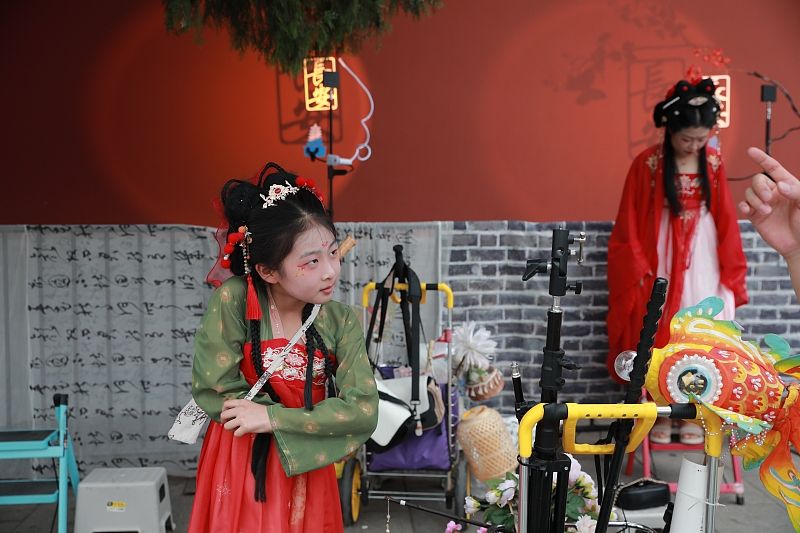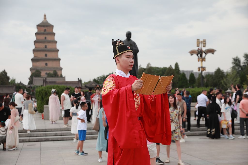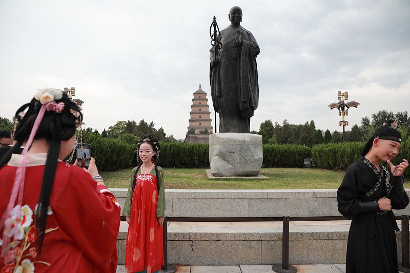 2024年6月27日,在西安大雁塔和大唐不夜城景区,身着汉服的游客在赏景拍照。在古城西安,参观文化古迹、体验汉服妆造、购买国潮文创等为代表的“新中式”旅游越来越受到游客欢迎。