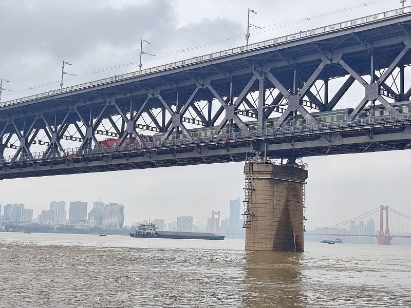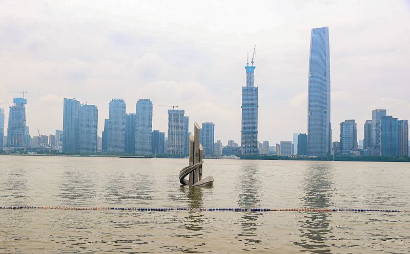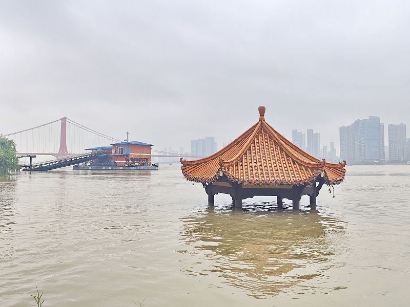 2024年7月2日,武汉,江水逐级漫上汉口江滩公园亲水平台。武汉市防汛抗旱指挥部已于7月1日22时将防汛Ⅳ级应急响应提升至Ⅲ级。据长江水文网实时水情监测数据显示,7月2日15时,长江汉口站水位已达27.57米,超警戒水位0.27米。