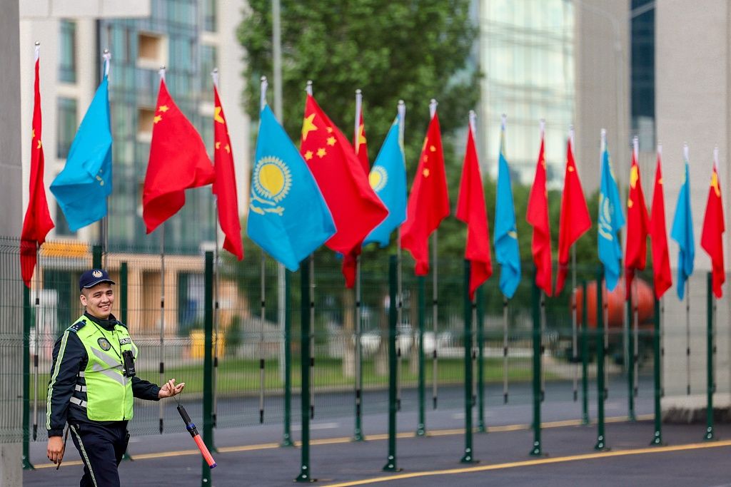 当地时间2024年7月3日,哈萨克斯坦阿斯塔纳,上海合作组织成员国元首峰会即将召开,哈萨克斯坦和中国国旗装点街道。