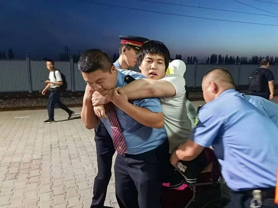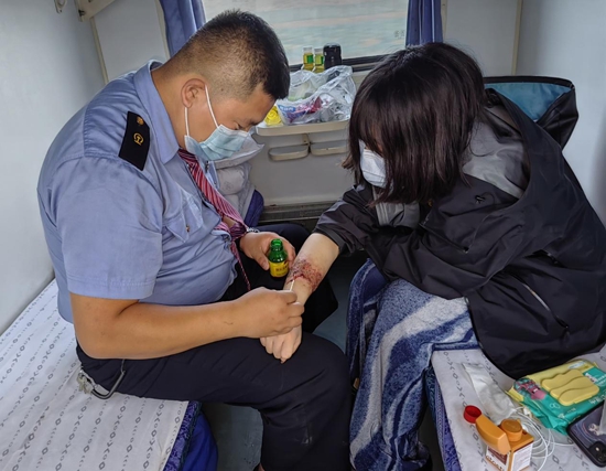 青年列车乘务员张利新与同事对特殊旅客进行救助。